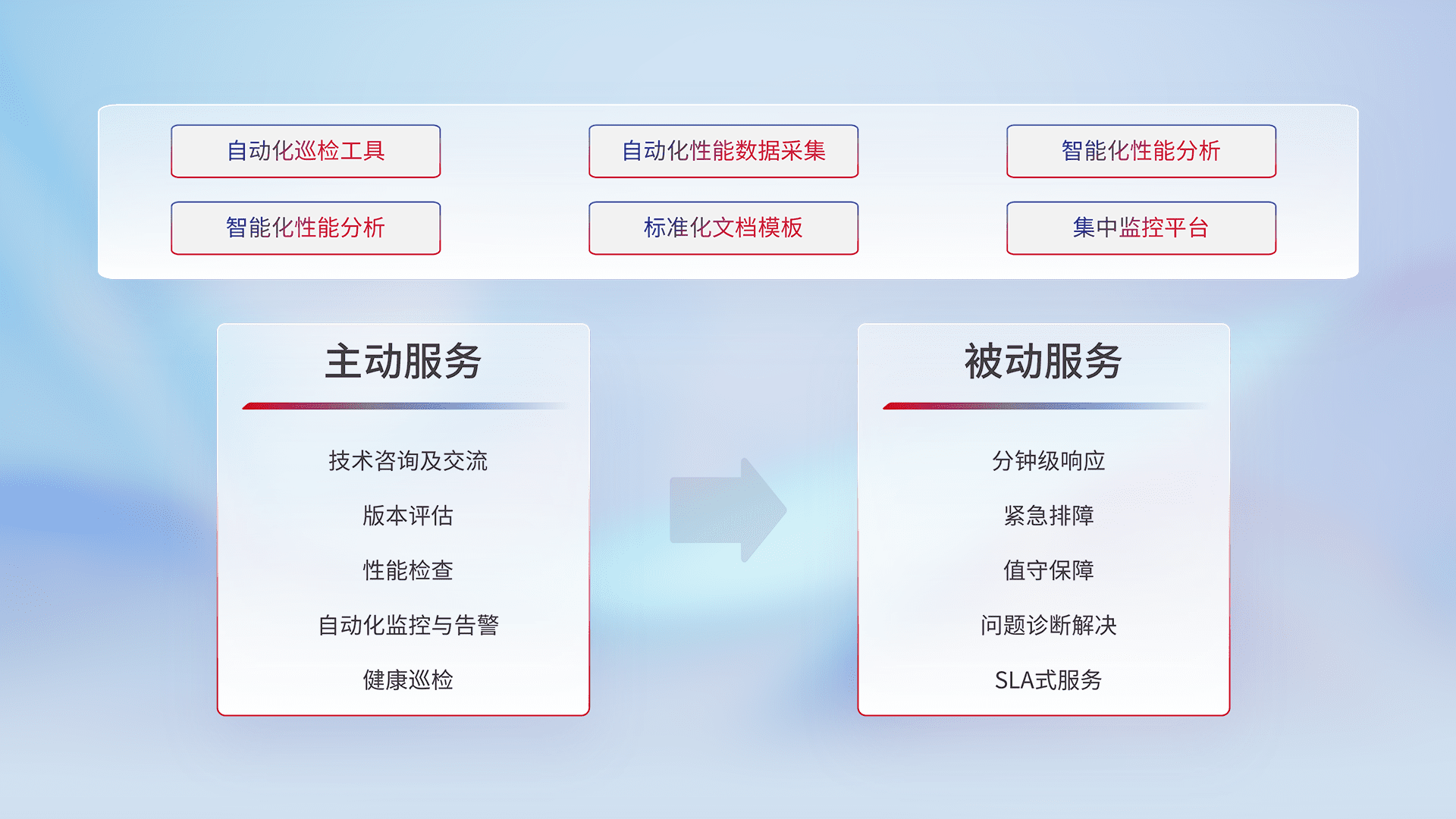 智能化工具和标准化文档,,保障服务质量,,,,提供主动服务(包含技术咨询、、、、版本评估、、性能检查、、、自动化监控与告警、、、健康巡检)和被动服务包含(分钟级响应、、、、紧急排障、、、值守保障、、、、问题诊断解决、、、SLA服务)。。。。
